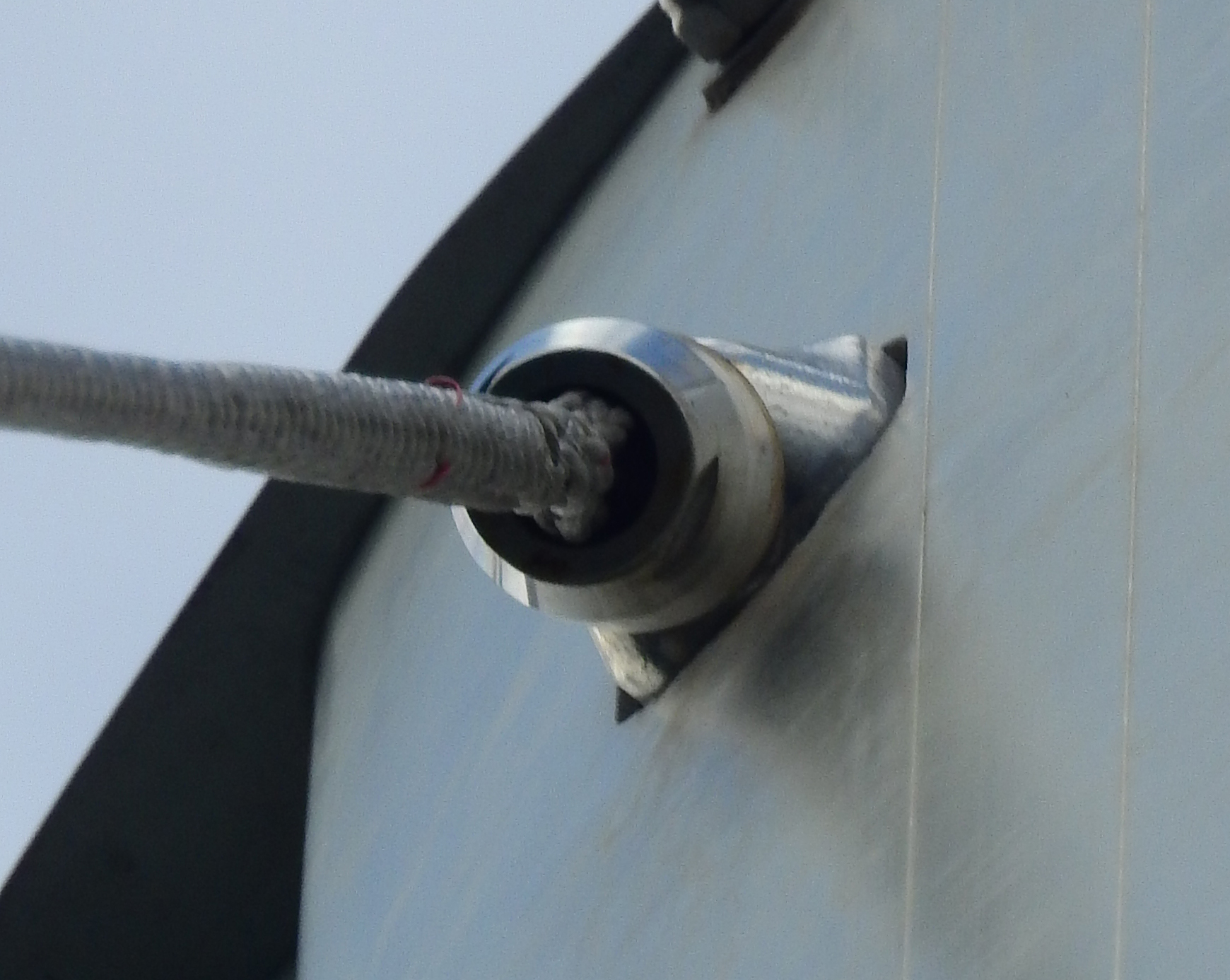 ![]() ![]() Der Schutz der Dyneema Leinen vor dem Schamfilen erfordert eine hohe Aufmerksamkeit. Hier ist es sinnvoll, berieits die Edelstahldrahtseile an kritischen Stellen zu markieren. Wie z.B. an den Saling Nocken. Der Lieferant kann an den Markierungen einen Schutz in Form eines Schutzmantels anbringen. An den Saling Nocken wurde auf der Aquarel mit einem dicken Schrumpfgummi schlauch das Dyneema Material geschützt. |