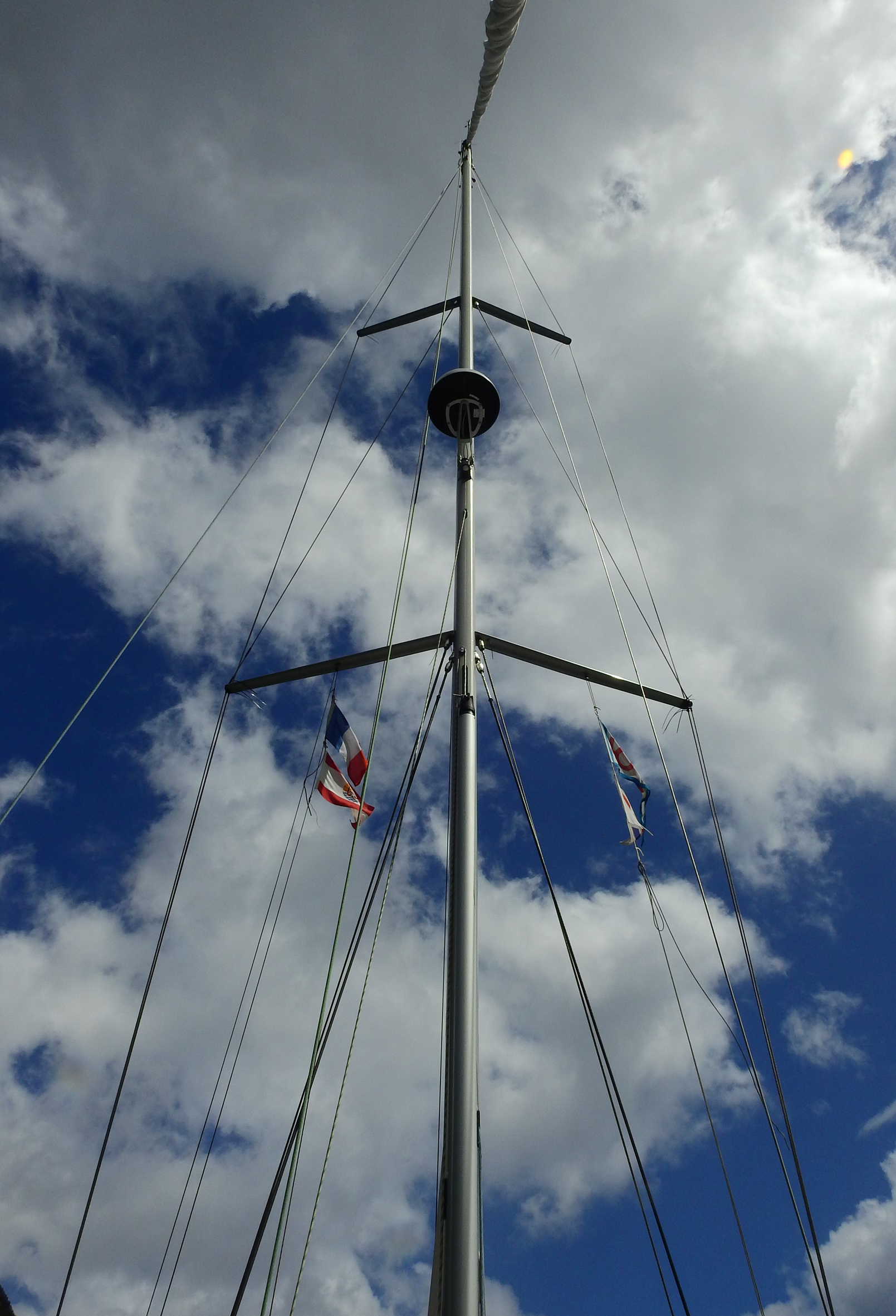 ![]() Der Masttrimm erfolgte nach den Kriterien der vorherigen Mastbiegung. Auf Grund der gepfeilten Salinge wird der Mast mit der Vorspannung der Oberwanten leicht vorgebogen. Der Reck der Oberwanten und des Achterstages hielt sich bisher in Grenzen. Es war nur einmal erfolrderlich die Wantenspanner um eine Umdrehung und das Achterstag um zwei Umdrehungen anzuziehen. |